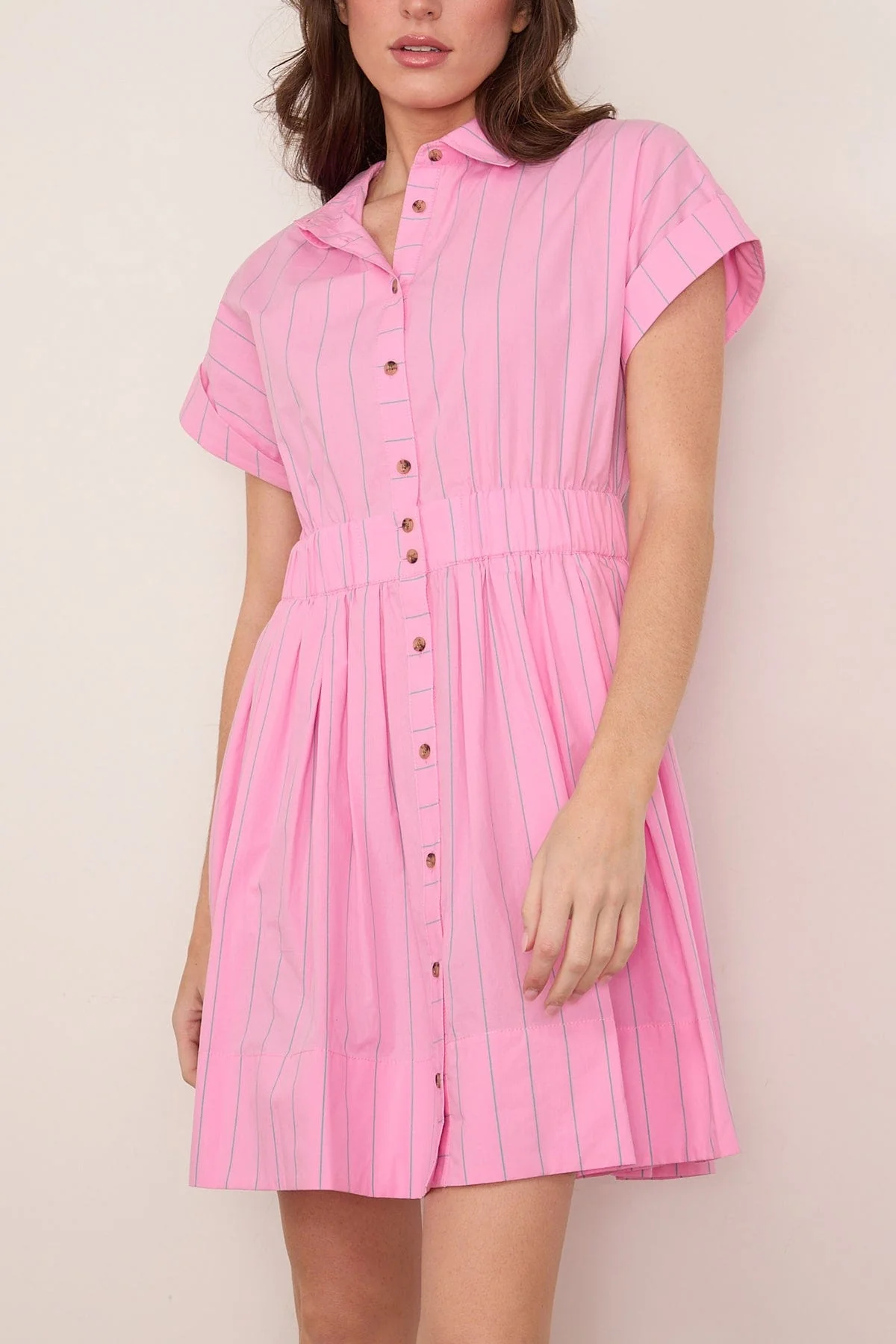 Hunter Bell's bestselling Howard Dress is back in their must-have Watermelon Stripe print for spring. With a relaxed collared bodice, banded short sleeves, button front, and full shirred skirt, itās equal parts effortless and elevated. An elastic waist defines the silhouette while offering comfort and ease, making it a go-to for everyday polish.